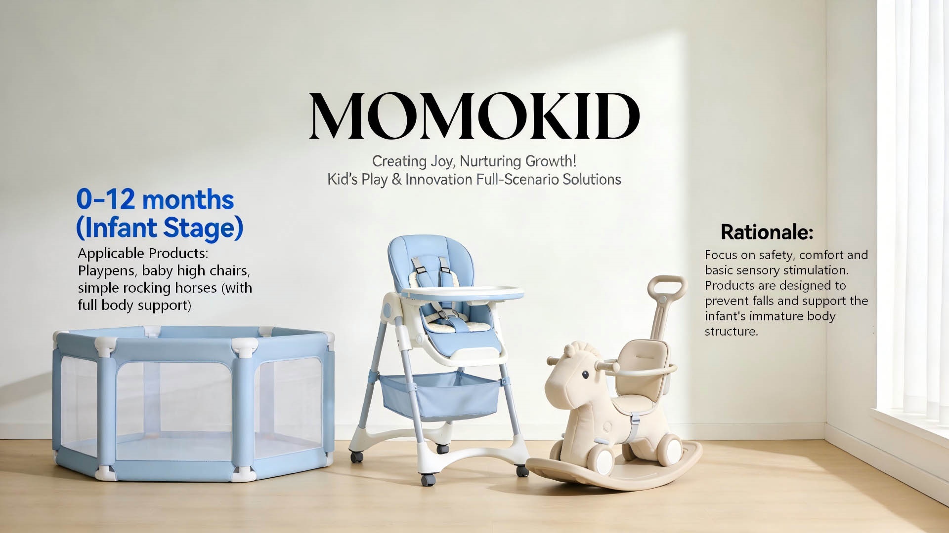Rationale: Focus on safety, comfort andbasic sensory stimulation.Products are designed to prevent fallsand support the infant's immature bodystructure.