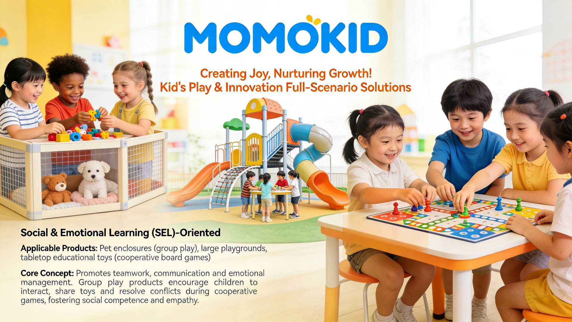 Social & Emotional Learning (SEL)-OrientedApplicable Products: Pet enclosures (group play),large playgrounds,tabletop educational toys (cooperative board games)